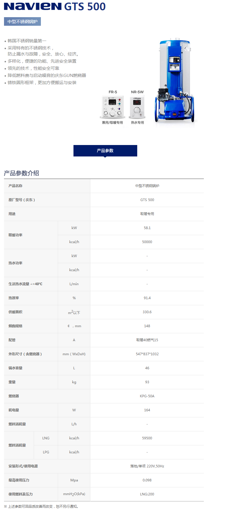 本页导读: 韩国进口庆东纳碧安NaVIeN不锈钢燃气锅炉GTS500取暖专用5万大卡地暖地热燃气锅炉燃油锅炉燃气壁挂炉燃气开水炉庆东纳碧安CASCADE冷凝系统